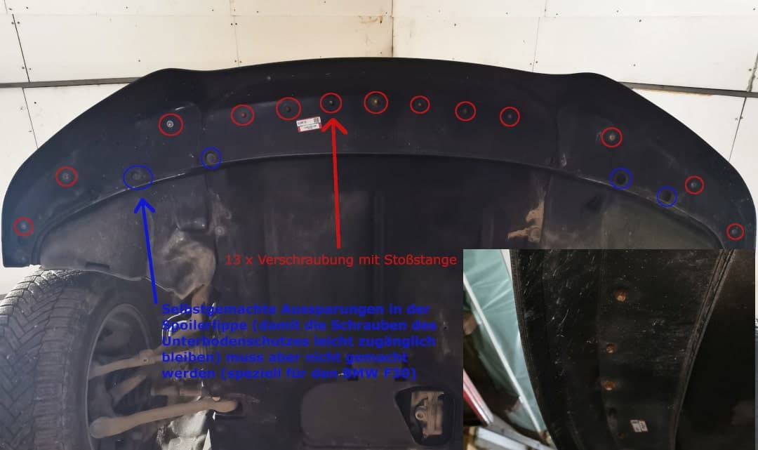 In diesem Schritt legst du dich unter deinen BMW F30 mit einem Bohrer. Eine zweite Person hält die Frontlippe an die Stoßstange passend dran. Die Lippe ist jetzt so quasi eine Bohr-Schablone für deine Stoßstange. Durch die Löcher in der Lippe bohrst du jetzt auch die gleichen Löcher in die Unterseite der Stoßstange.