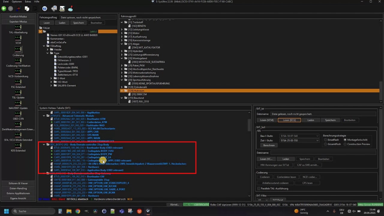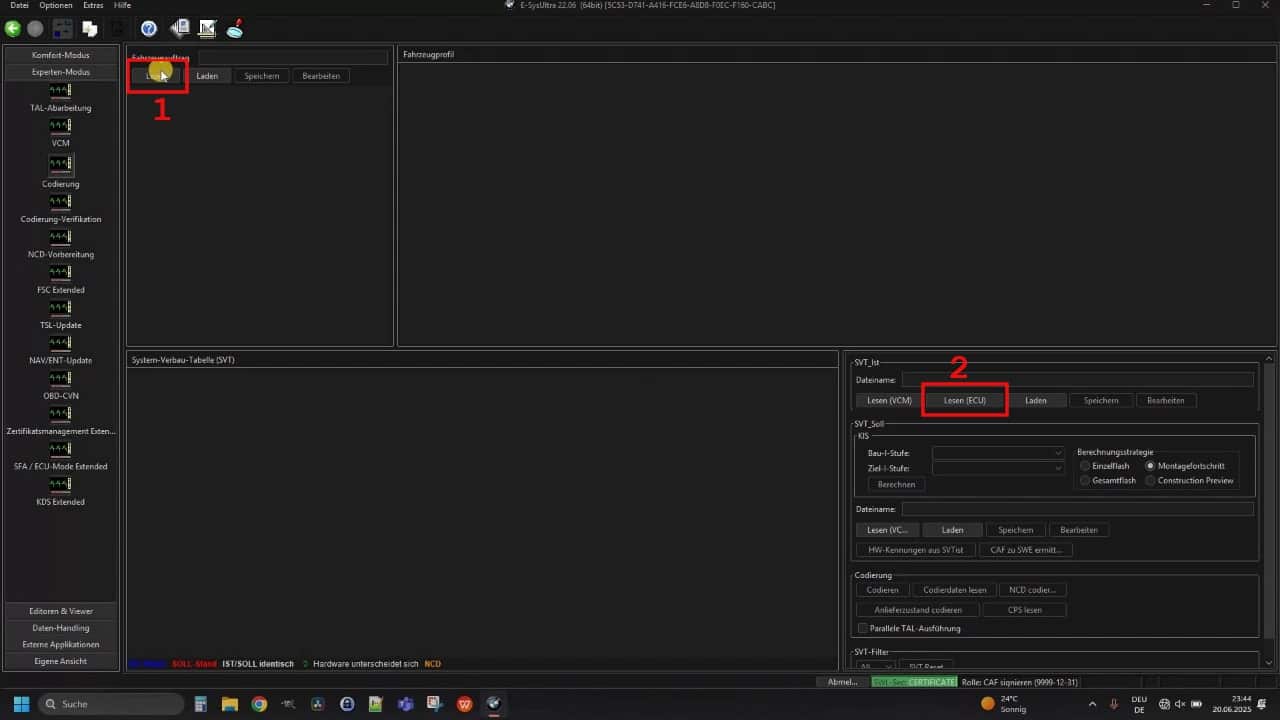 Click above under „Vehicle order“ on „Read“ and then at SVT_actual on the button „Reading (ECU)“.