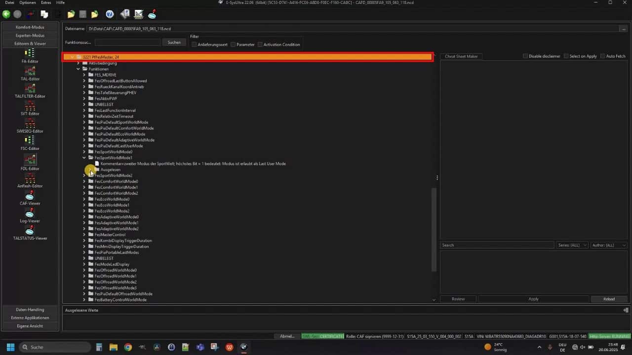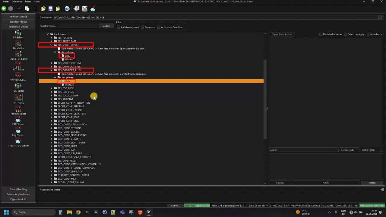 The procedure is the same as before in step 2, to access the parameter list for this control unit. Under „3008 FES“ search for the parameters „FES_SPORT_EXPERT“ all the way to „FES_COMFORT_PLUS“ and set both from „not active“ to „active“ um.