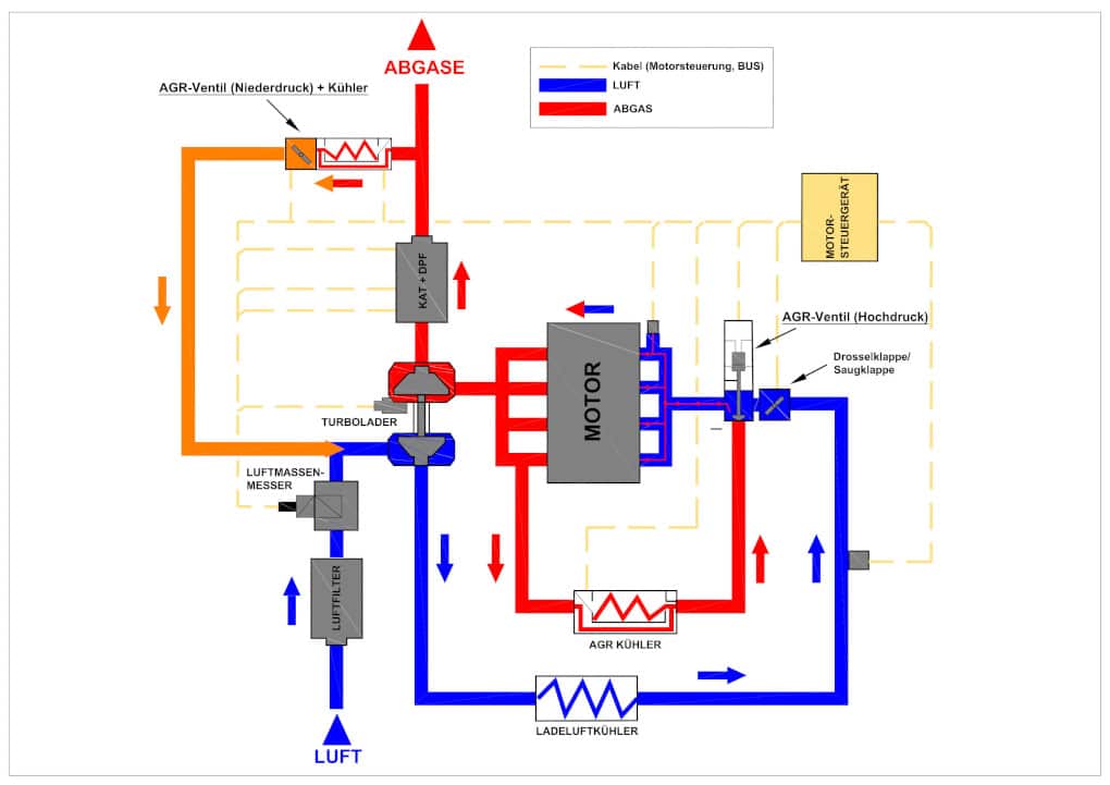 In this process, the exhaust gas is taken from the low-pressure side behind the particulate filter and reintroduced before the compressor of the turbocharger. The dosage is controlled by the low-pressure EGR valve. An exhaust flap provides the necessary exhaust backpressure. This method continues to reduce nitrogen oxides. The combination of the high-pressure and low-pressure EGR systems achieves nearly a 90% reduction in nitrogen oxides in diesel vehicles. Filters before the exhaust (e.g., catalytic converter, DPF, etc.) also contribute to this.
