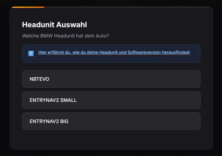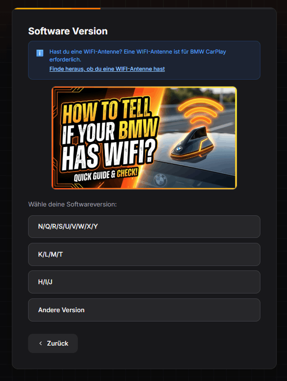 Außerdem prüft dieser auch, ob dein BMW für Fullscreen CarPlay geeignet ist oder nur für Splitscreen CarPlay. Der Generator führt dich durch die einzelnen Schritte und zeigt dir auch, wo du die benötigten Daten deines Fahrzeugs überall findest.