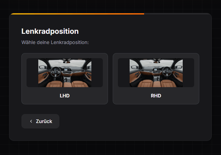Im “Step 4” wählst du deine Lenkradposition aus. Entweder “RHD” für “Lenkradposition rechts” oder “LHD” für “Lenkradposition links”