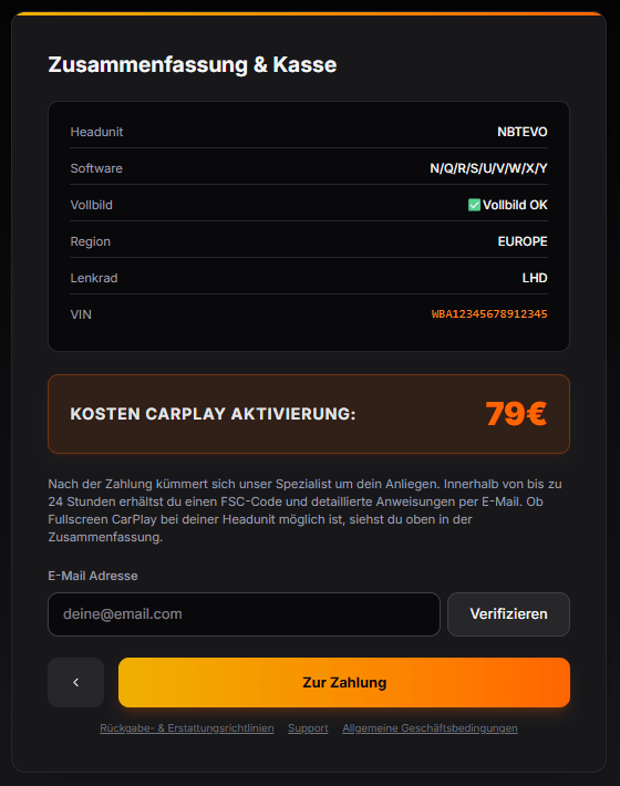 Im letzten Step nämlich dem “Step 6” kontrollierst du als Erstes nochmal deine ganzen Eingaben. Zusätzlich zu der Resumen wird dir ausgegeben ob deine Headunit-Version Fullscreen Carplay oder nur Splitscreen Carplay unterstützt. Wenn alles passt trägst du deine E-Mail Adresse korrekt ein, klickst auf verifizieren und schlussendlich auf den Button “Zur Zahlung”. Dort wirst du zur Zahlungsseite weitergeleitet.
