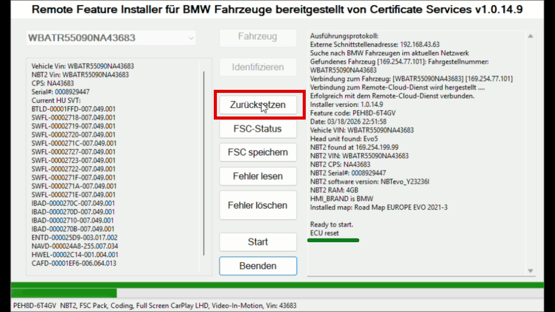 Sobald du deinen FSC-Code bekommen und die Software heruntergeladen hast (wird beim Kauf über den Generator mitgeschickt), geht es mit dem ENET-Kabel und dem Windows Laptop ins Auto.