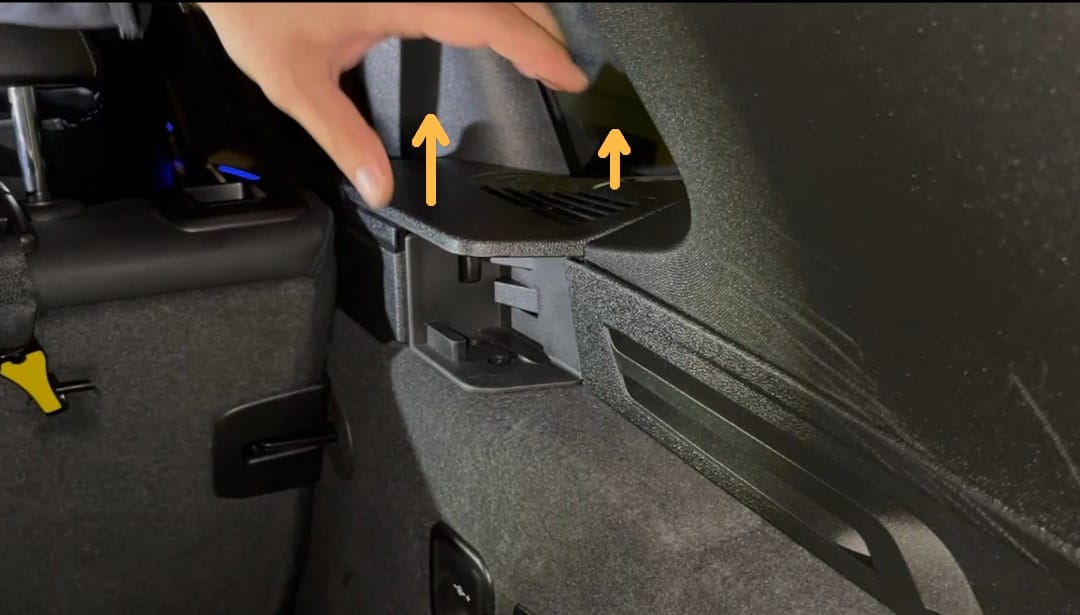 A continuación, retira la cubierta que rodea el botón de liberación de la cubierta enrollable. Simplemente puedes desengancharla hacia arriba y retirarla.