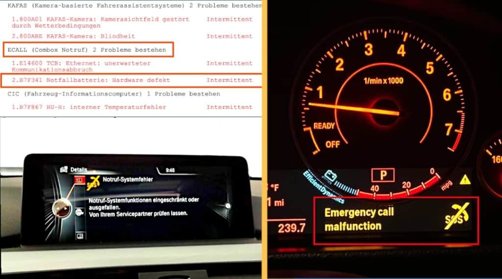El mensaje de error "Error del sistema de llamada de emergencia BMW" aparece frecuentemente en la pantalla de algunos modelos BMW, tanto antiguos como nuevos. El código de error B7F341 se almacena entonces en la memoria de fallos. En la mayoría de los casos, la causa es una batería SOS defectuosa o profundamente descargada, también llamada batería de llamada de emergencia. El código de error B7F341 en la memoria de fallos también indica una batería SOS defectuosa como causa. La batería forma parte de la unidad de control de telecomunicaciones, que inicia automáticamente la llamada de emergencia en caso de accidente. Si la batería de emergencia está vacía o dañada, este servicio ya no puede funcionar de manera fiable, lo que provoca el código de error. El reemplazo oportuno de la batería TCB resuelve el error de forma permanente.