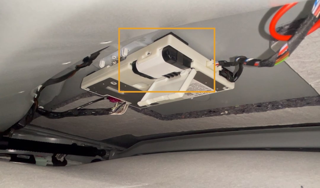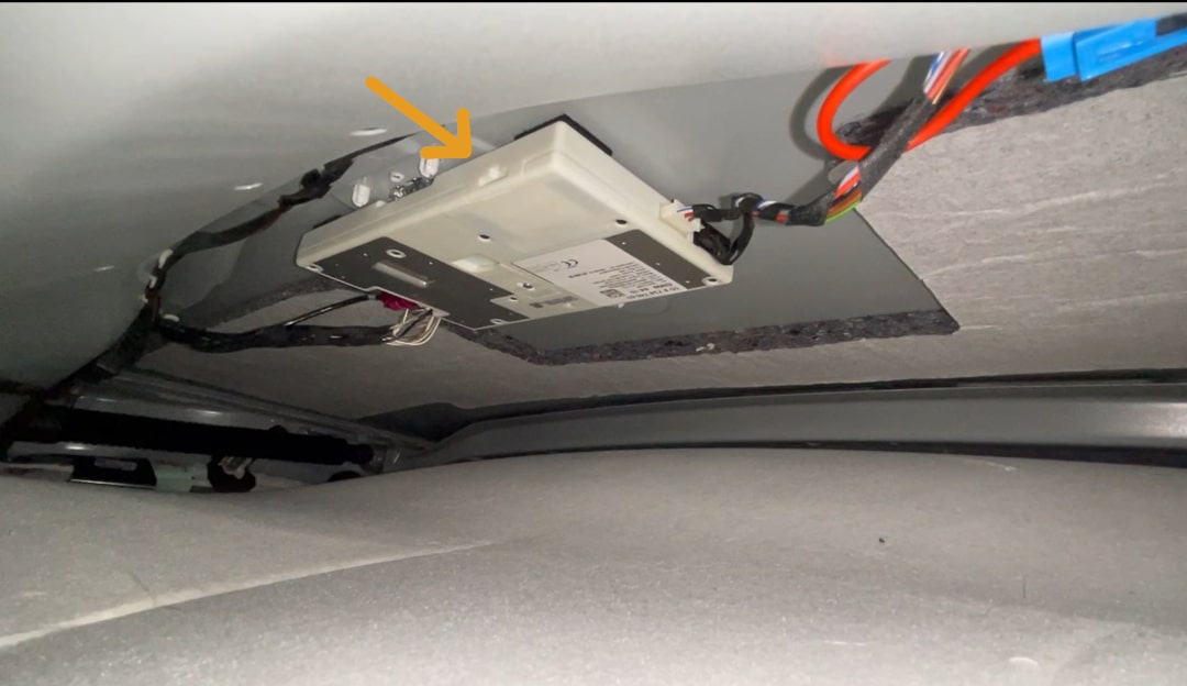 Ahora la unidad de control telemático (TCU) es visible bajo el techo interior. La batería está ubicada en el compartimento delantero derecho de la unidad de control. Lo mejor es abrir el compartimento de la batería con un destornillador de punta plana delgada. A continuación, podrás extraer la batería fácilmente, a menos que caiga por sí sola.