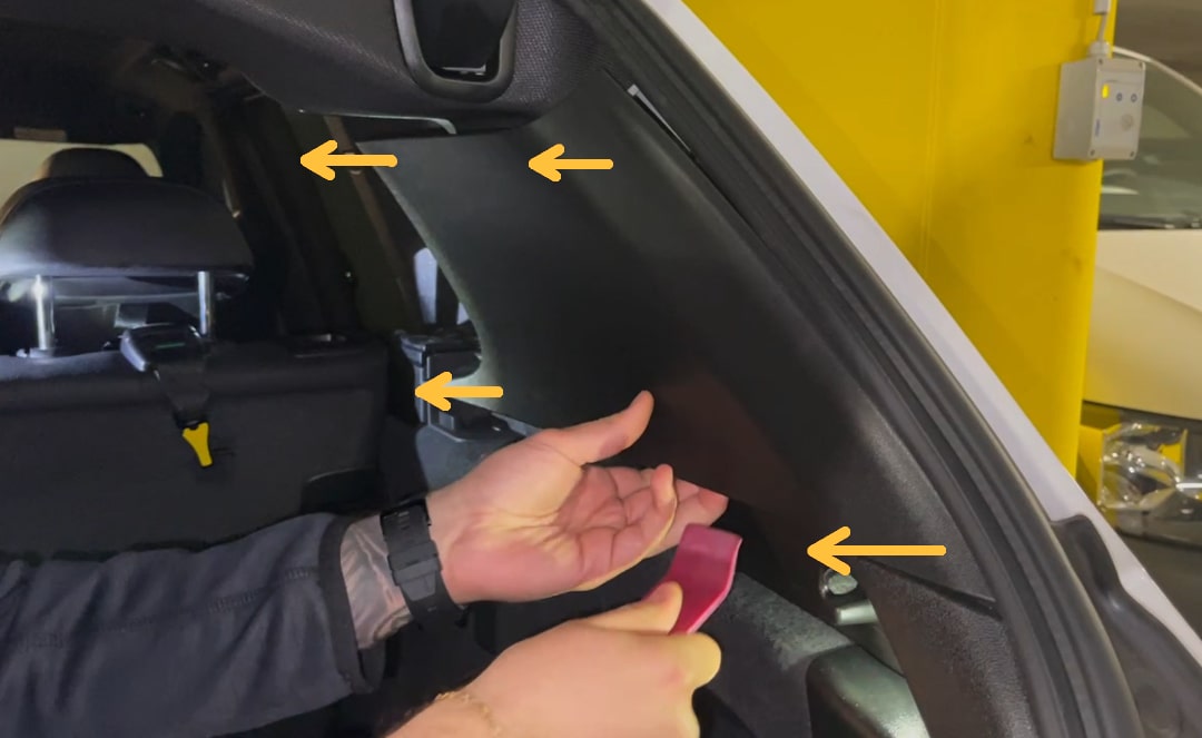 A continuación, tira con cuidado del revestimiento del pilar D hacia afuera. Para ello, es mejor utilizar una herramienta de desmontaje* para hacer palanca suavemente y retirar la moldura plástica de los clips. El procedimiento es idéntico en ambos lados del vehículo.