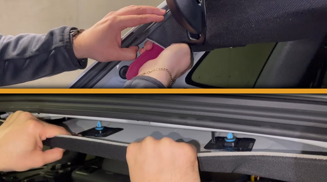 Suelta los clips del techo interior a lo largo de la abertura trasera. Simplemente tira del techo interior hacia abajo, lo cual debería ser relativamente fácil. La ventaja es que no necesitas bajar todo el techo interior para acceder a la unidad de control de telecomunicaciones (TCU).