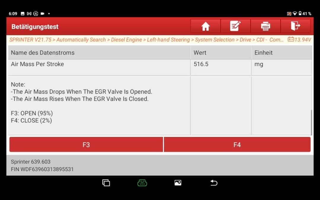 Durante esta prueba, el dispositivo de diagnóstico le muestra el valor de la masa de aire y la posición de la válvula EGR. Al cerrar o abrir la EGR con los botones de abajo, debería ver un mayor diferencia en la masa de aire ver. El Ruido del motor también debe modificarse.