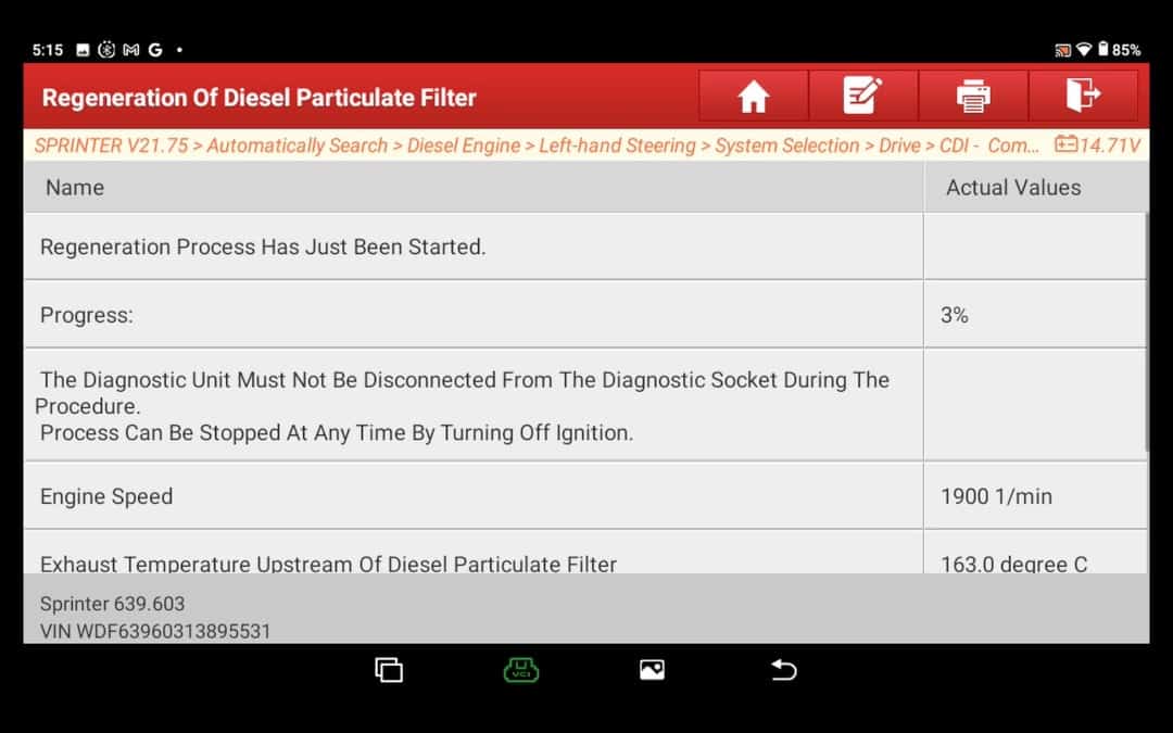 En la mayoría de los casos, el los gases de escape y el refrigerante alcanzan una temperatura determinada para activar la regeneración del filtro de partículas. Si se cumplen las condiciones mostradas y no hay advertencias pendientes, puede iniciar la regeneración con el botón de abajo. Iniciar regeneración.