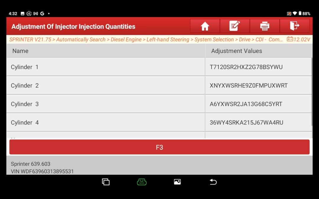 Una vez en el menú, encontrará la opción código largo de cada inyector del motor. A continuación, puede utilizar estos códigos si usted tiene un cambio de inyector que ha llevado a cabo, o la introduzca los códigos de los nuevos inyectores.