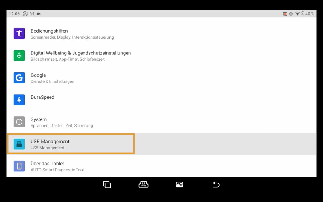 Si utiliza el dispositivo de diagnóstico Launch conectarse al PC por primera vez debe tener en cuenta lo siguiente. En los ajustes del dispositivo en "Gestión de USB" el Desactivar "Conmutador USB".