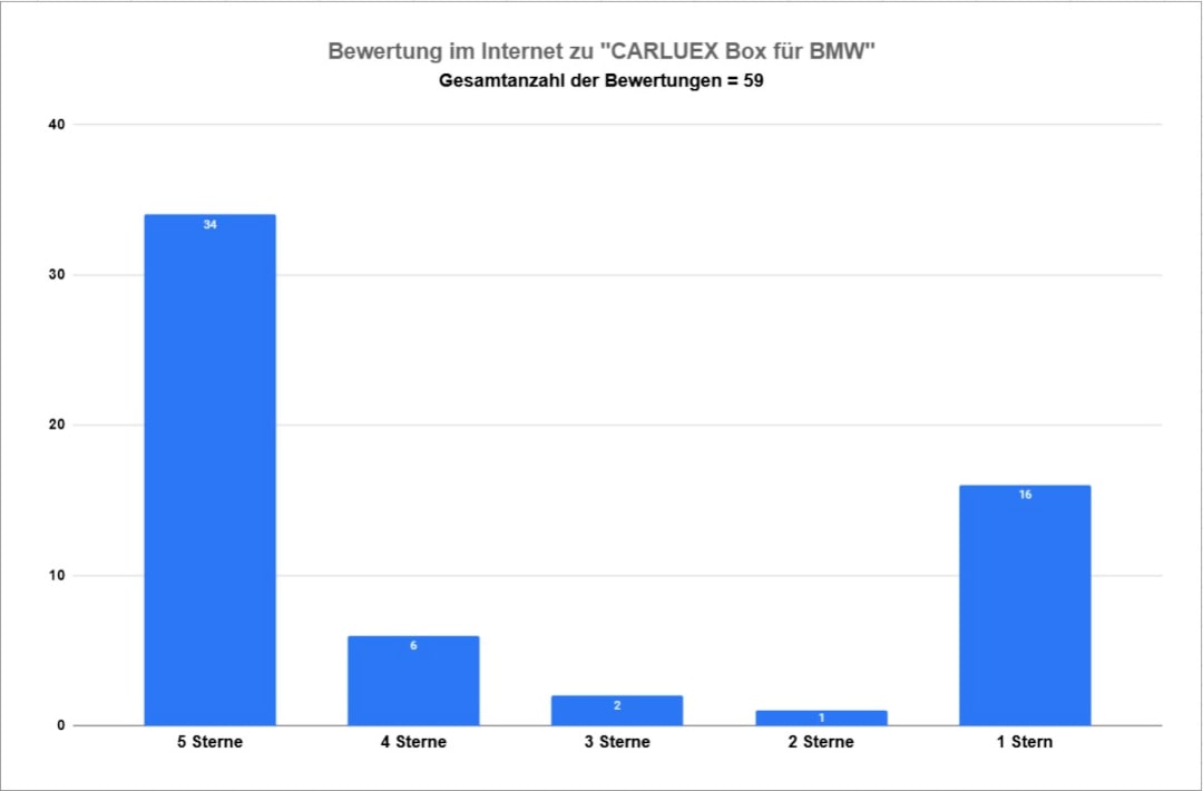Ponieważ CARLUEX Box dla BMW jest znany dopiero od niedawna, w krajach niemieckojęzycznych wciąż jest stosunkowo niewiele recenzji. Jednakże, na podstawie międzynarodowych recenzji, raportów z forów i naszych własnych testów, przedstawia się następująca statystyka: