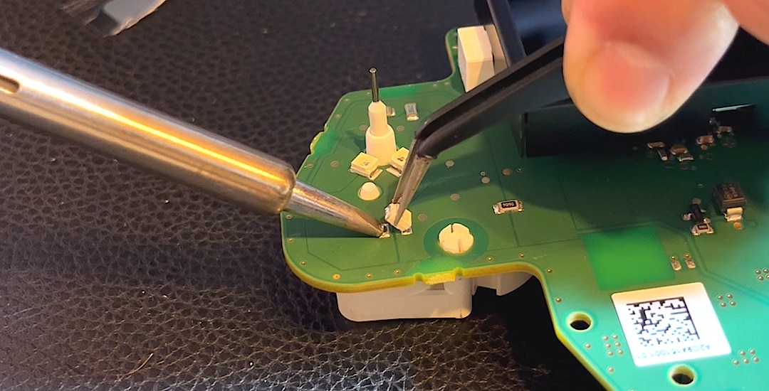 Kolejny krok to uchwycenie nowej diody SMD za pomocą pęsety w taki sposób, abyś mógł łatwo przesunąć ją na wcześniej pokrytą lutem miejscówkę, jednocześnie unosząc lutownicę do diody LED i połączenia lutowniczego. Następnie ponownie stopisz lut i przesuniesz nową diodę LED na połączenie lutownicze, gdy lut będzie jeszcze w stanie ciekłym.