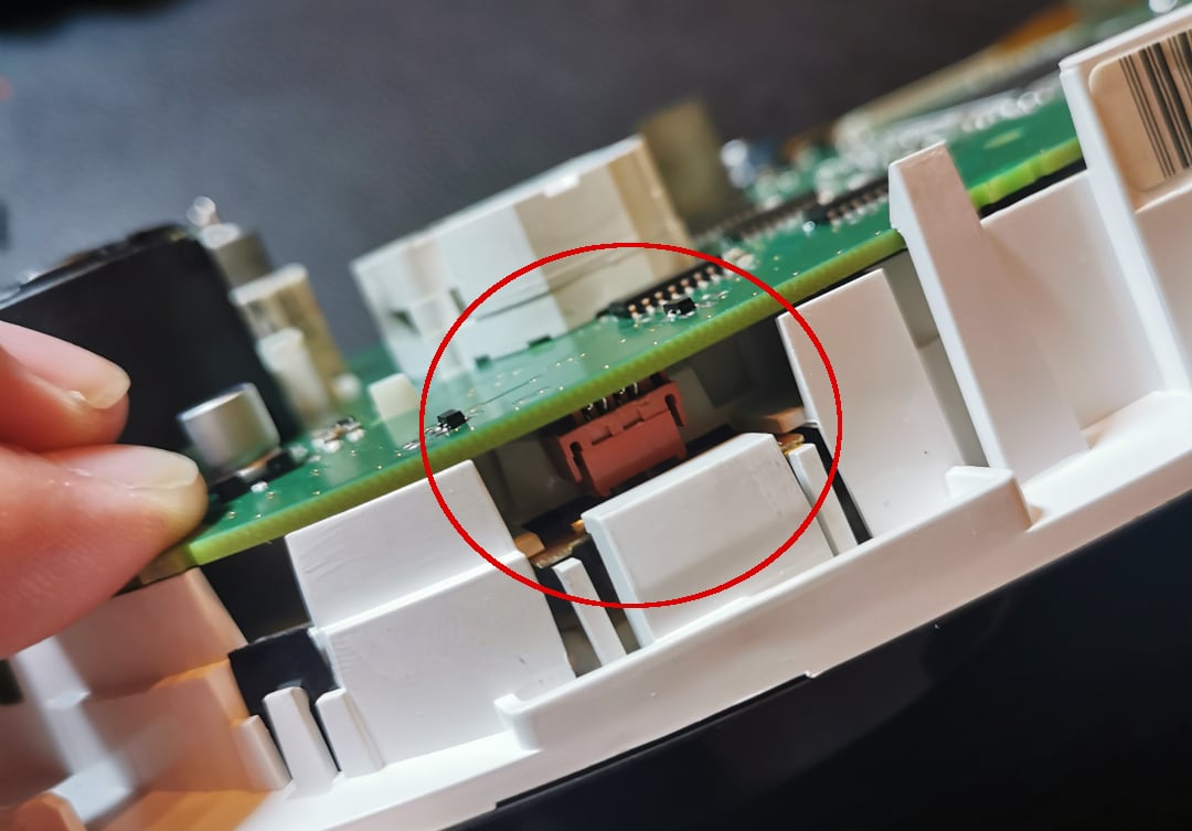 Zwróć uwagę na czerwony złącze tempomatu na górnej stronie. Łatwo może się zdarzyć, że podczas ponownego łączenia płytek czerwony złącze nie zostanie prawidłowo włożone. Jeśli tak się stanie, możesz łatwo pomóc ręką lub pęsetą, delikatnie dociskając złącze.
