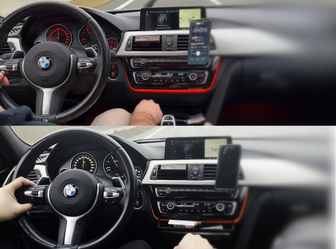 Tutaj przygotowaliśmy dwa zdjęcia przed/po. Jedno przed modyfikacją z pomarańczowym podświetleniem deski rozdzielczej, a drugie po modyfikacji z białym podświetleniem deski rozdzielczej i czerwonymi wskaźnikami: