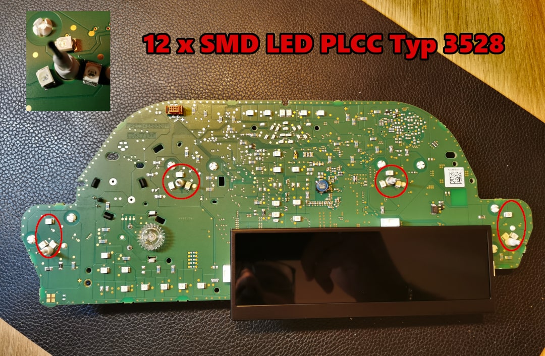 Jeśli chodzi o komponenty, ograniczają się one zasadniczo do nowych diod SMD w wybranym kolorze i folii na wskazówki. Do podświetlenia wybraliśmy kolor biały, a do wskazówek kolor czerwony. W prędkościomierzach modeli BMW F stosowane są standardowe diod SMD typu 3528 PLCC. Są one niedrogie i łatwo dostępne. Alternatywnie można zastosować diody 0805.