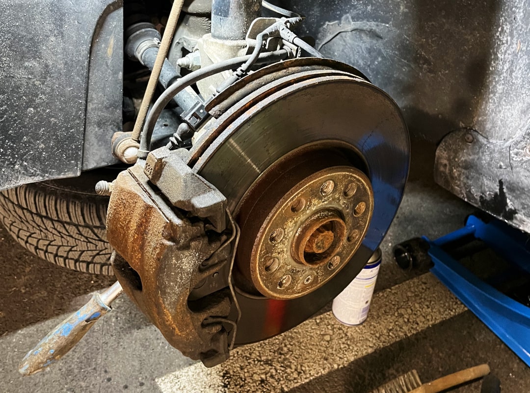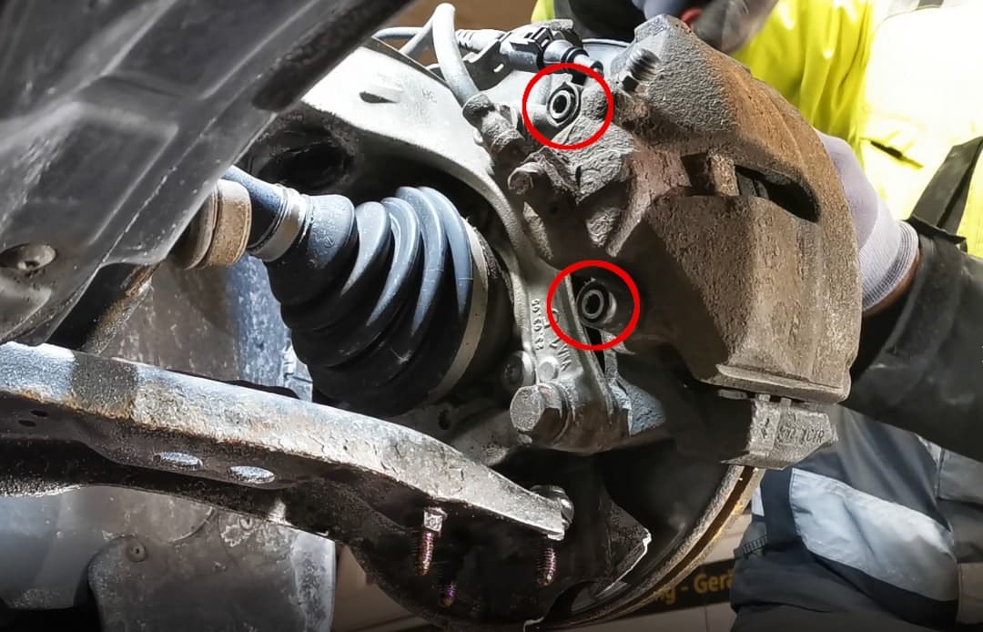 Główną przeszkodą w tej naprawie jest zdecydowanie ryzyko złamania śrub, szczególnie tych w nośniku hamulca. Śruby korodują i zacinają się z czasem, zwłaszcza jeśli podczas wcześniejszych napraw nie stosowano właściwego momentu dokręcania. Dlatego podczas odkręcania zapieczonych śrub zawsze powinieneś używać ciepła, smaru takiego jak WD40 i przede wszystkim cierpliwości.