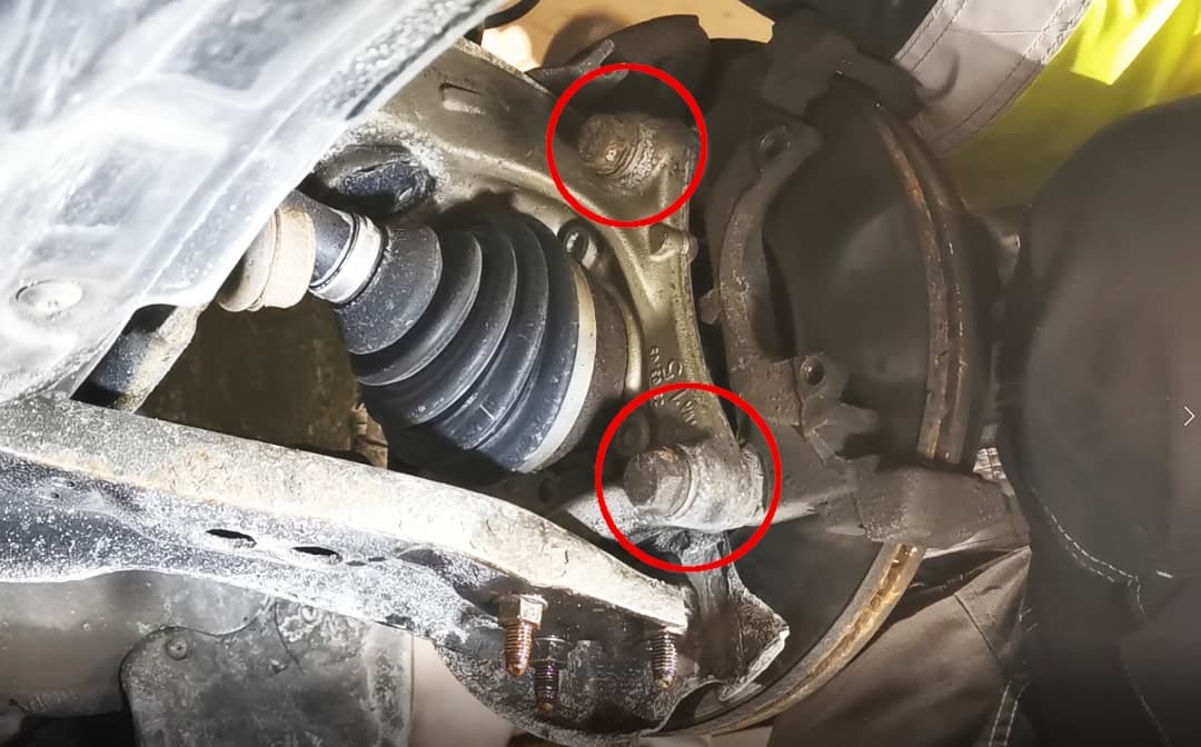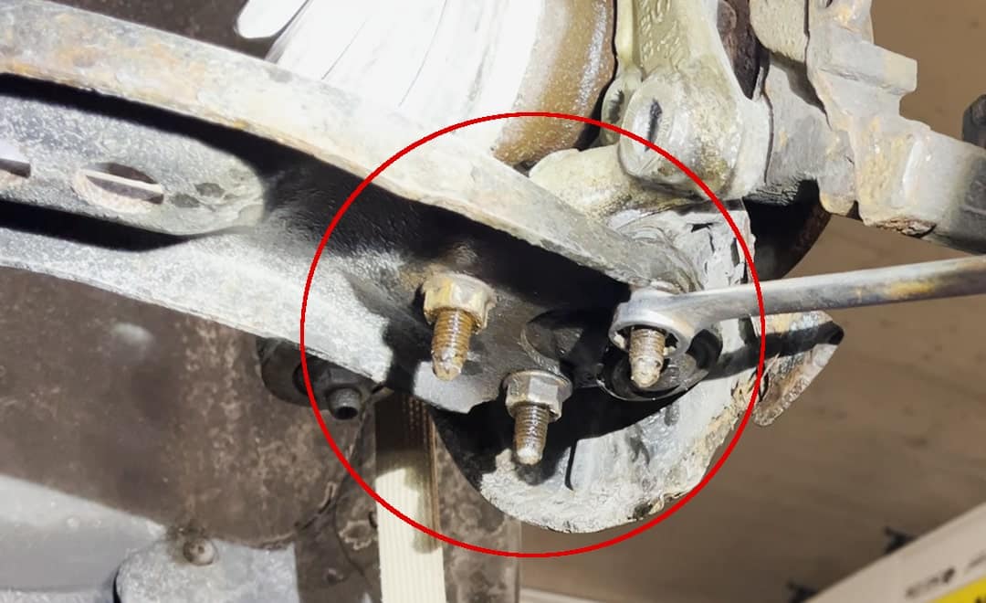Pod całym zawieszeniem koła znajdują się śruby mocujące wahacz. Poluzuj je za pomocą nasadki numer 18 i wyciągnij wahacz z zawieszenia, aby uzyskać swobodny dostęp od tyłu.