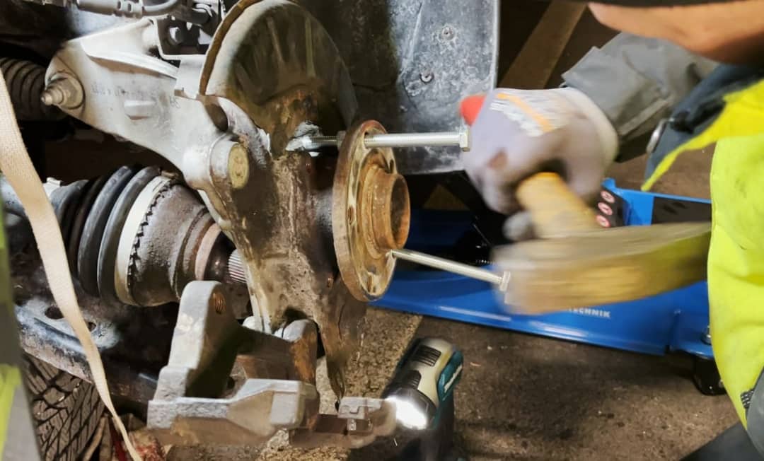 Zaleca się, aby przed rozpoczęciem pracy krótko oczyścić wszystkie mocowania szczotką drucianą i nasmarować WD-40. Dzięki temu można zapobiec zakleszczonym śrubom. Jeszcze lepiej byłoby wykonać to dzień przed wymianą łożyska koła.