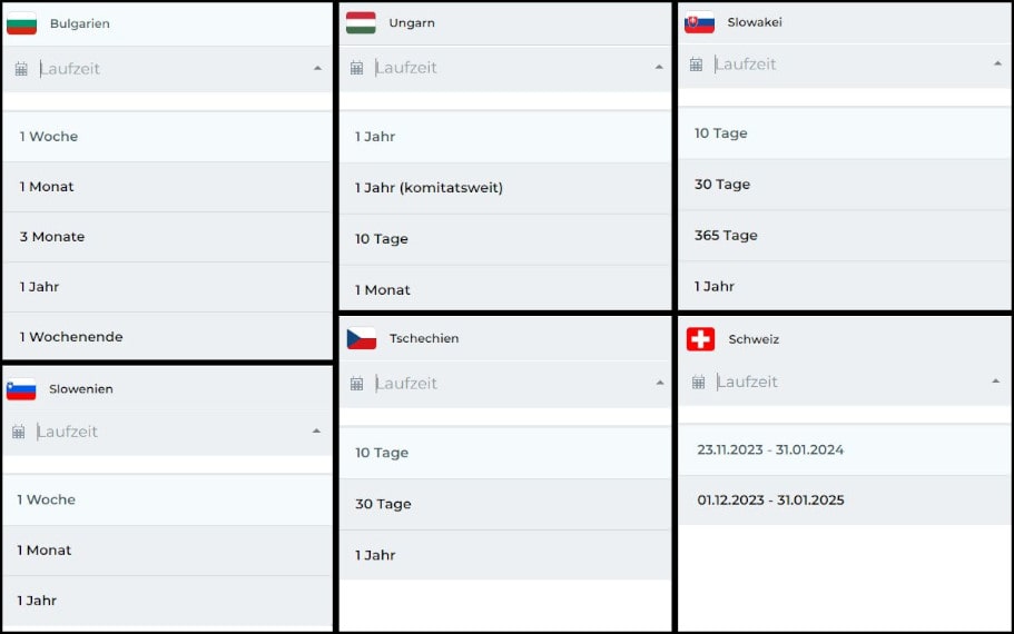 Jedes Land hat seine eigenen Regeln. Daher unterscheidet sich auch die Gültigkeitsdauer der Vignetten von Land zu Land. Wie auch bei den Fahrzeugkategorien erfährst du in der folgenden Grafik, welche Arten von digitalen Vignetten es für welches Land gibt.
